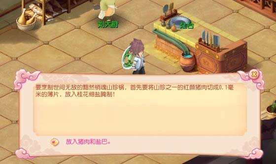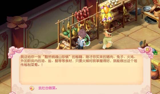 天有不测风云,人有祸福旦夕!刘大厨本要亲自下厨,却被老鼠吓得,打翻了滚烫的油锅,手上起了好大的水泡……他将烹制“黯然销魂山珍锅”的全部食材和秘籍传授于你,只要你按照他的步骤去做,在灶台处烹饪,经过五道工序、六分耐心、七成火候、八分娴熟、九分注意、十分专心,定能做出让王百万泪流满面的“黯然销魂山珍锅”的。