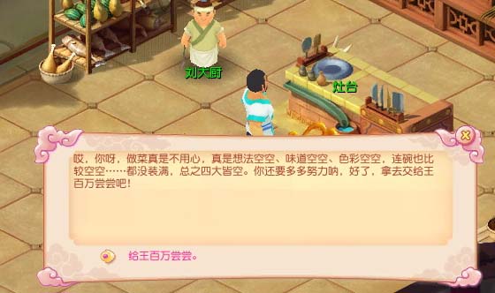 最差结局:非常不幸,这菜实在是太难吃了又咸又苦还有点焦,王百万生气地离开了,老板和刘大厨生气的批评你,并把你给开除了,此时你伤心欲绝。