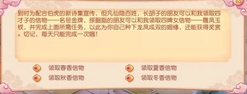 又拿奖励又好玩的活动,不做白不做,赶快上前找他领取属于自己的信物吧!(男性可领江南四大才子信物,女性可领春夏秋冬四婢女的信物。)