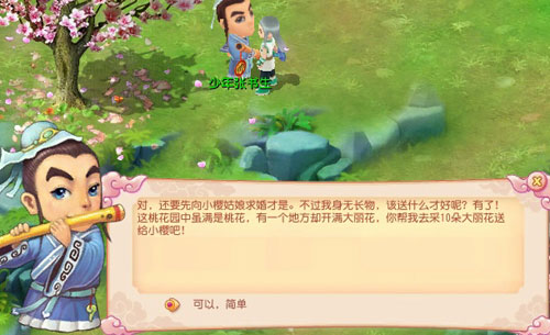 在这片春光明媚的桃花园里,少年张书生正在思慕一位美丽的少女,这似乎也很正常,他请你将自己写的情诗交给那位名叫小樱的姑娘,表达自己的倾慕之情。