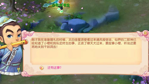 小樱虽然非常害羞,但还是答应了这门亲事,这可是个好消息,你赶紧去恭喜少年张书生。他也非常高兴,并请你作为他们的主婚人,不过他要准备一下,请你等上30秒再去找他。