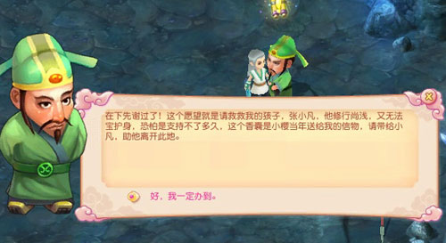 又看到中年的张书生了,他始终都平静的接受命运,真是很了不起。他向你道谢,并说出了第二个心愿,那就是救他的儿子――张小凡离开这里,并且把当年小樱送给他的香囊也拿出来,请你交给张小凡,劝他离开。真是用心良苦的父亲啊。