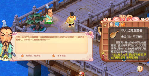 进入是非台以后,趁答题赛尚未开始,赶快找到三阳真人吧,除了可以再熟悉一下答题规则外,还可以领取一个“惊天动地查题器”。此物乃三阳真人所发明,从来只赠有缘人,不过到时候你夸他一句很帅他就会给你了。在活动中使用“惊天动地查题器”,就可以帮助你查看活动当前所发布的题目,是不是很有创意呢。