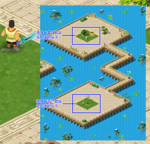 当当当当,接下来答题活动开始喽!注意留意聊天频道所给出的问题,这些问题均为判断题,如果你选择是,就表示你应该站到上面的台子去,如果你选择否,就表示你应该站到下面的台子去。
