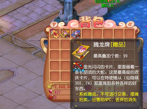 这就是最后一张神奇的欢庆卡片――“腾龙牌”,有了它,你就能去找东方甲子太保身后的特使随从换取大奖啦!