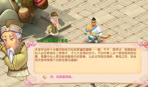 伯乐的研究精神感动了你,加上他答应事成之后会推荐你为弼马温,所以,信伯乐,有官做!行动吧!来到陨仙墓后,打开瓶子结果却没有唤出雷兽。大�逯�下只好返回伯乐办公处找他,得知原来是伯乐的小童子玩骰子输掉了雷音瓶,怕被责骂才找了外形相似的夜叉瓶来替代。无奈之下,伯乐只好请你再去翰风原拜访托塔天王探讨一番。