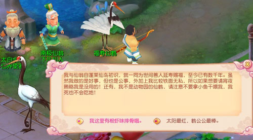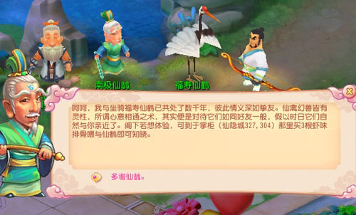 仙翁就此问题做了一番官方发言,见你还是大惑不解,就告诉你去买3根虾味排骨喂给他的坐骑福寿仙鹤便可知晓了。