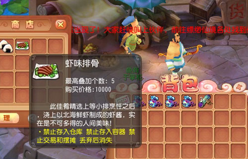 5、南极仙翁(仙隐城132,174)充满学术性的发言令你大惑不解,于是他嘱咐你去鱼商于掌柜(仙隐城252,46)那里买三根虾味排骨,然后喂与他的坐骑仙鹤(仙隐城134,175)即可知晓。