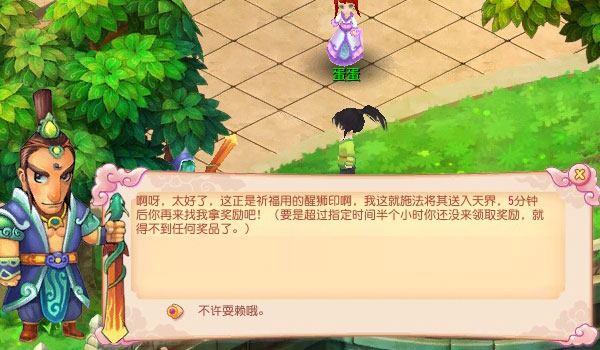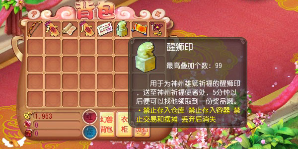 物品说明:用于为神州雄狮祈福的醒狮印,送至神州祈福使者处,5分钟以后便可以找他领取到一份奖品哦。