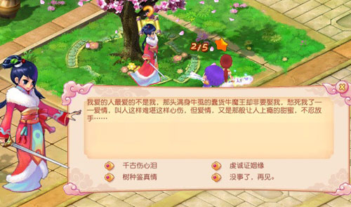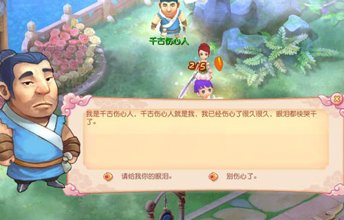 你问有情人的眼泪哪里来?七夕这个节日固然是无数情侣的甜蜜时刻,但那些为情所伤的千古伤心人却不住垂泪,在仙隐城内,你可以找到这些可怜的家伙,从他们那里取得7滴眼泪不在话下――这种眼泪真情无限,7滴眼泪就足够换一颗爱情之果啦。