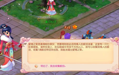 只有有情人的眼泪才能让真情树成长、结果,紫月仙子有一个七彩菩提瓶,用这个菩提瓶可以收集有情人的眼泪。如果你和你的伴侣可以用七彩菩提瓶收集7滴有情人的眼泪,就可以换一颗珍贵的爱情之果啦。