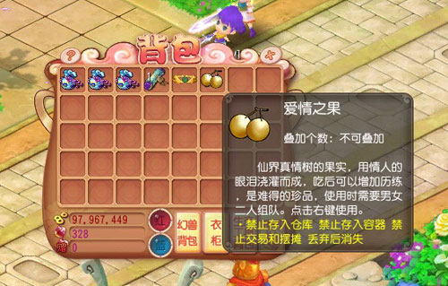 爱情之果:仙界真情树的果实,用情人的眼泪浇灌而成,吃后可以增加历练,是难得的珍品,使用时需要男女二人组队。点击右键使用。 使用爱情之果可获得: