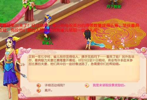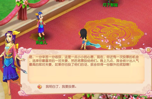 当然,还有最重要的一环――投票。选择一对你最喜欢的夫妻吧,然后将票投给他们,晚上21点,荆雀儿会统计出得票数最多的那对夫妻,如果你也正好投了他们,就会获得一份额外的大奖哦!