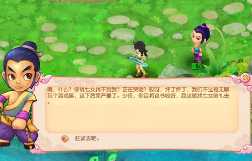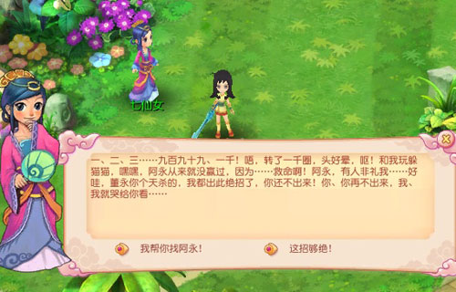 来到荆雀儿处了解一下,得知这些夫妻中有很多因为初历仙隐盛景,在看热闹的时候便不知不觉走散了,真是�宕罅恕;剐枰�你赶快去帮助他们找到自己的另一半,惊喜在等着你哦。你在仙隐城内走啊走啊,找啊找,嘿,一个熟悉的身影和名字出现在你的眼前,你定睛一看:七仙女。他正在为自己的阿永哥哥走丢了而着急呢。