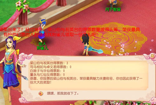 4、晚上21点统计出得票数最高的一对夫妻,到荆雀儿处查询自己是否中奖。