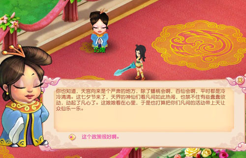 这巧娘是王母娘娘身边的红人,此事交与她最为妥当。当然为了要顺利完成任务,巧娘也给大家带来了一些特别的七夕礼物,快快去找她了解一下吧。