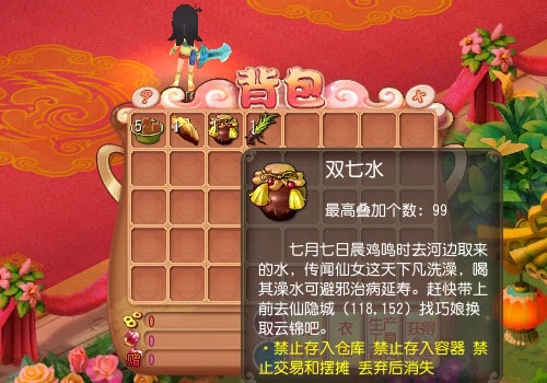 物品说明:七月七日晨鸡鸣时去河边取来的水,传闻仙女这天下凡洗澡,喝其澡水可避邪治病延寿。赶快带上前去仙隐城(118,151)找巧娘换取云锦吧。