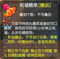 说明:万圣节特地为嘉宾准备的可口糖果,食用后可获得3小时神之祝福。点击右键使用。