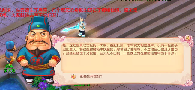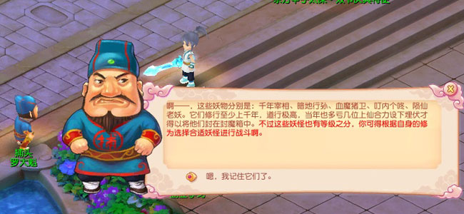 捕头・罗大魁正在城中急急奔走呢,不断的告诉周围的老百姓晚上出门要小心妖怪, 身为缥缈仙境五大门派的弟子,斩妖除魔这种事情,你肯定是跑不掉的啦,况且听说还有不错的奖励,赶快去找罗大魁捕头问一下吧。