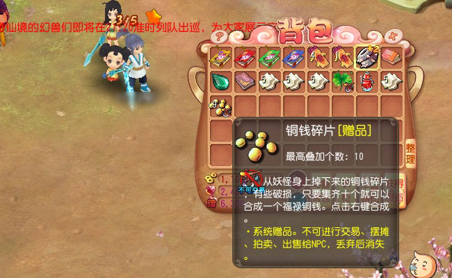 物品说明:从妖怪身上掉下来的铜钱碎片,有些破损,只要集齐十个就可以合成一个福禄铜钱。点击右键合成。 |